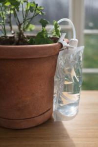 No plumbing or faucet hookup needed. The compact bag hangs neatly behind the plant and feeds water through a small tube.